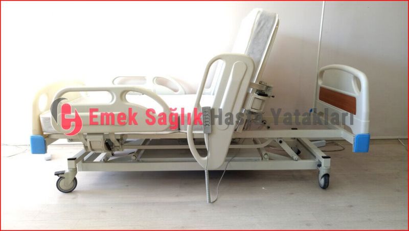 Elektrik motoru ile bel altı ve bel üstü yüksekliği ayarlanabilen hasta karyolası. Kilitlenebilir yan korkuluklar ve frenli tekerlek sistemi